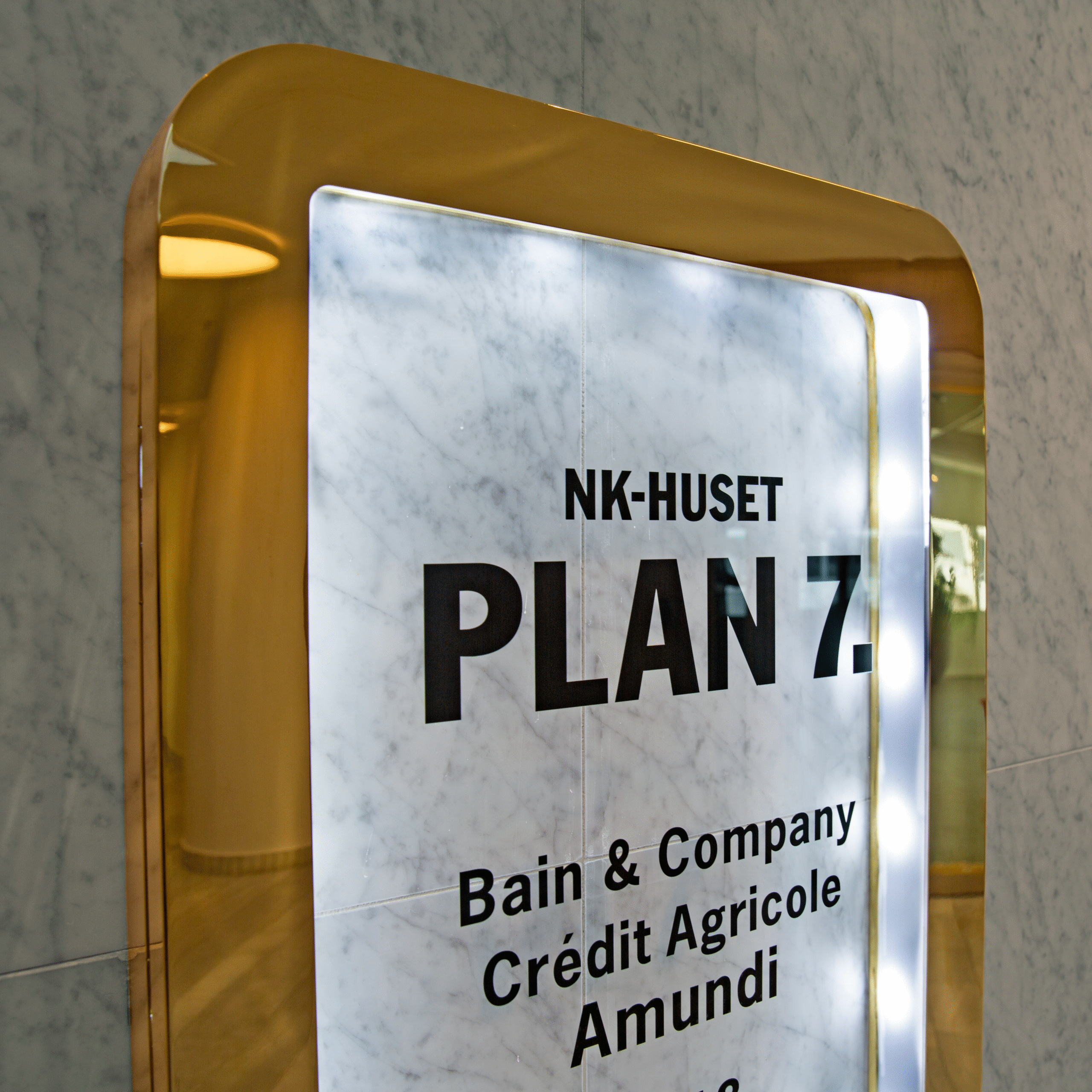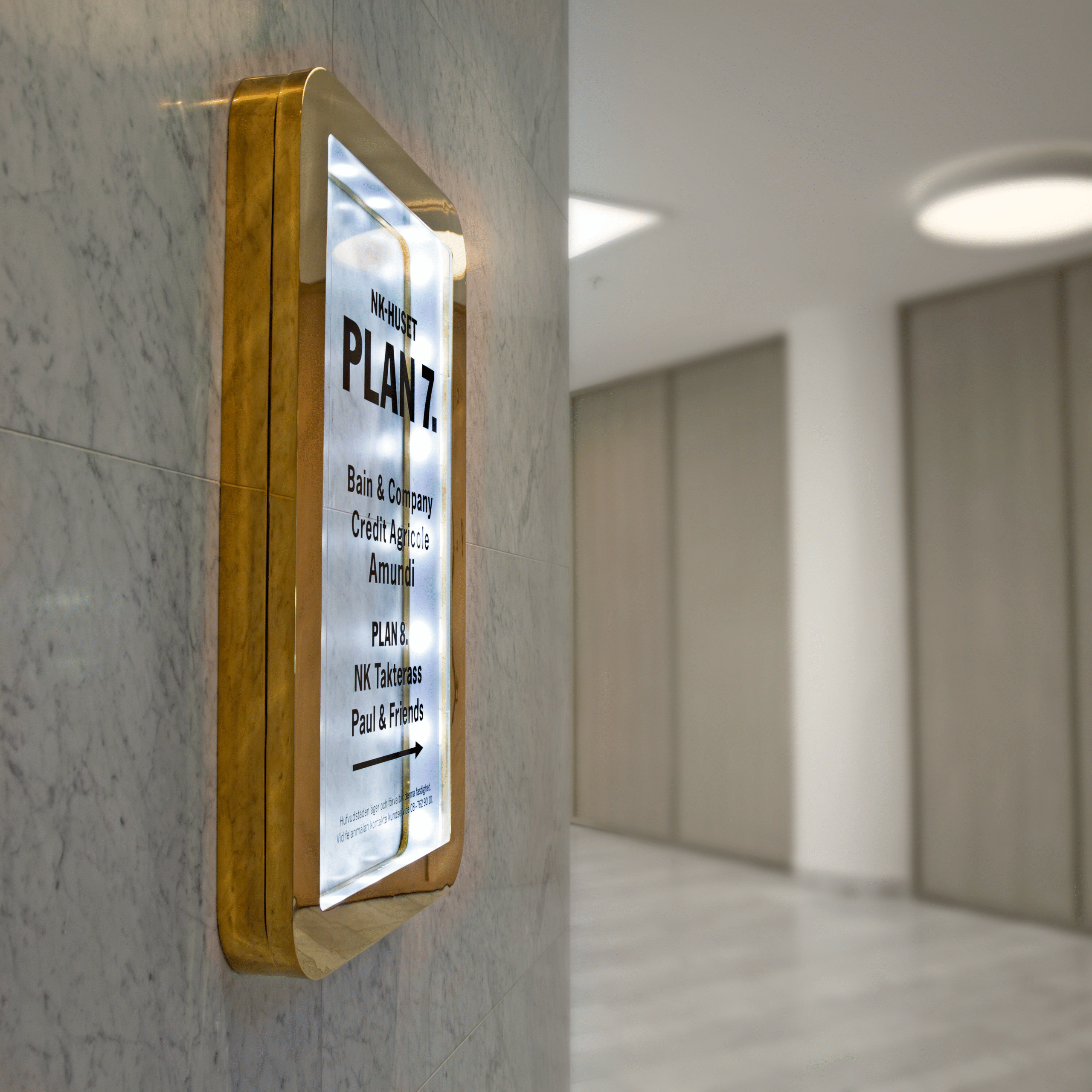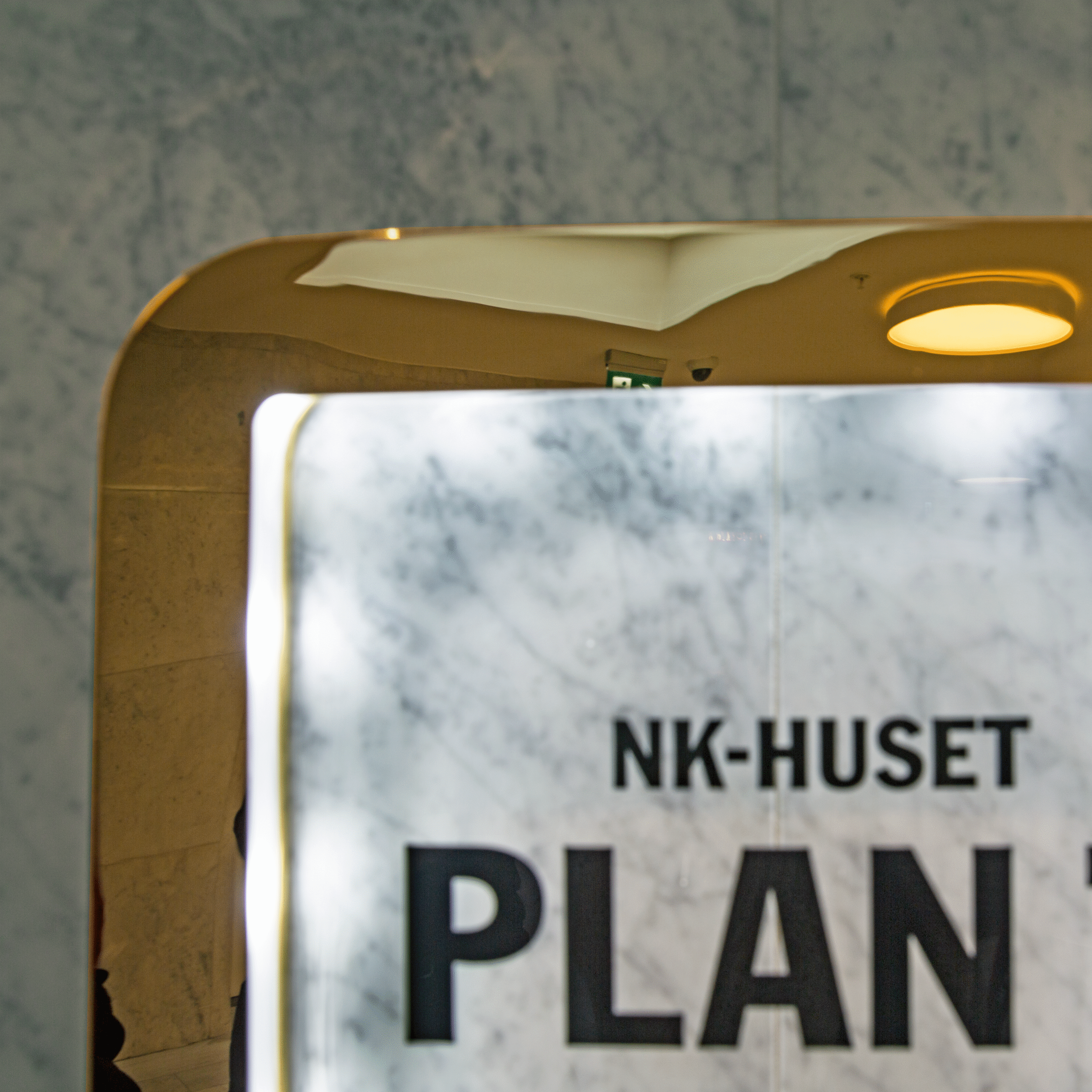 Ett exklusivt infoskåp för NK-Huset och Hufvudstaden, utformat för att lyfta fram fastighets- och hyresgästinformation på ett stilrent sätt. Konstruktionen har en genombruten design utan baksida, vilket skapar en luftig och modern känsla. Ramen är tillverkad i blank guldtitanlegerad rostfri plåt och är inifrån belyst med energieffektiv LED, vilket ger ett exklusivt sken runt skåpets innehåll. Dörren består av klarglas med vinyldekor monterad på baksidan för skydd och tydlighet.