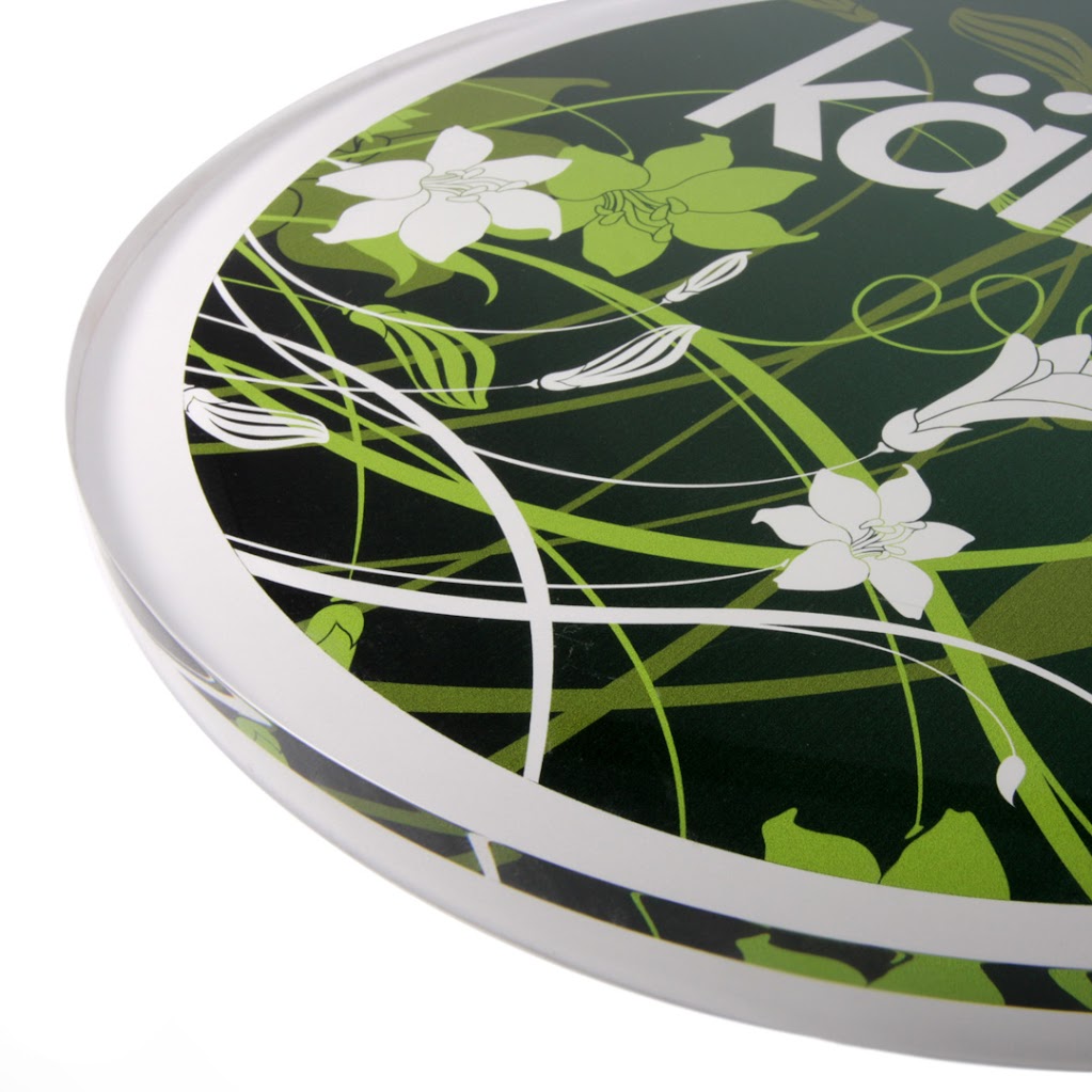 Källan receptionskylt – rund transparent akrylskylt med digitaltryck